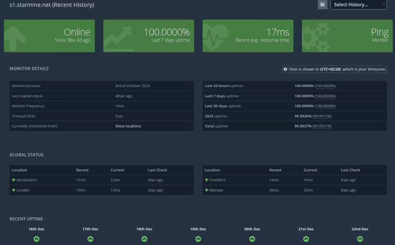 En bas de la page de monitoring, vous pouvez vérifier la latence du serveur depuis différentes zones géographiques (Amsterdam, Londres, Francfort, Varsovie). Cela vous permet de confirmer que la machine est accessible avec un excellent temps de réponse partout en Europe.